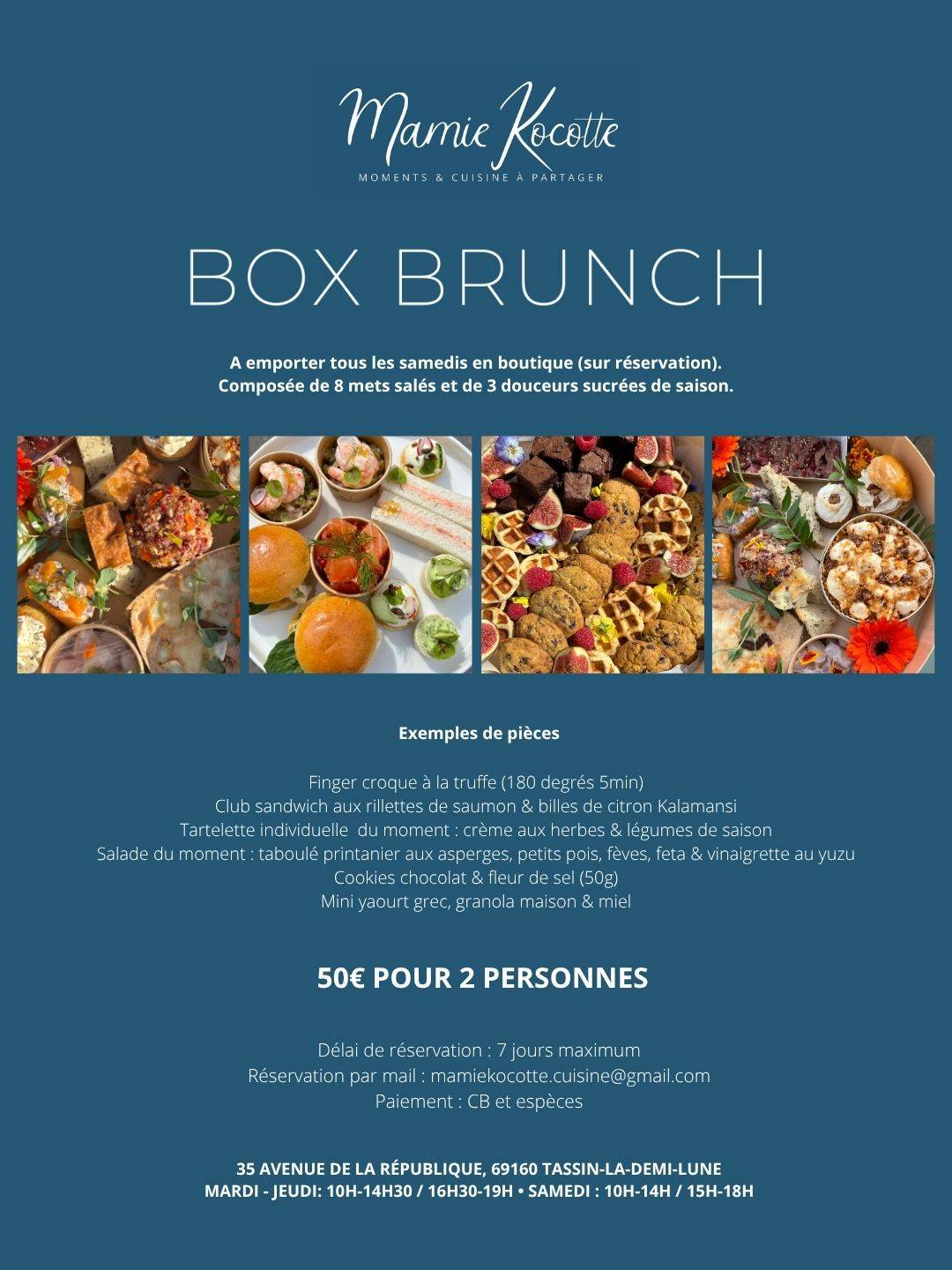 Chez Mamie Kocotte, les Box Brunch sont de retour pour vos samedis gourmands. Chaque box, conçue pour 2 personnes au prix de 50€, comprend 8 mets salés et 3 douceurs sucrées, préparés avec soin par notre équipe selon les saisons et l’inspiration du moment.